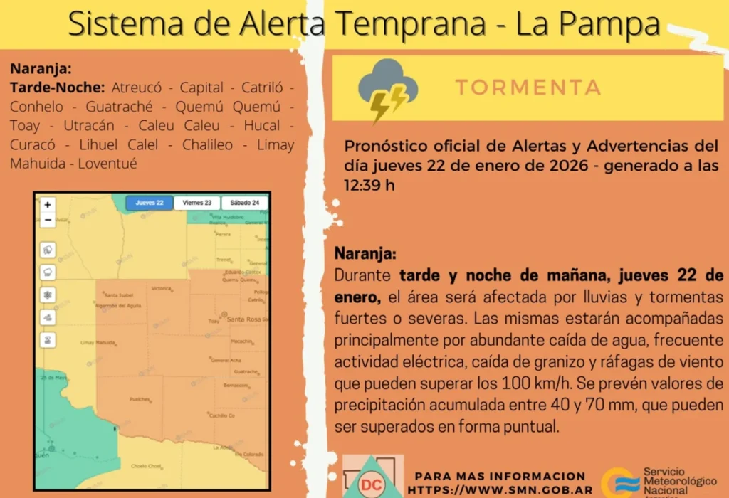 El Servicio Meteorológico Nacional emitió una alerta naranja para la provincia de La Pampa por lluvias y tormentas fuertes a severas previstas para la tarde y noche del jueves 22 de enero. El fenómeno podría incluir abundante caída de agua, actividad eléctrica frecuente, granizo y ráfagas que superarían los 100 km/h. Las autoridades recomiendan extremar cuidados, evitar actividades al aire libre y seguir información oficial.