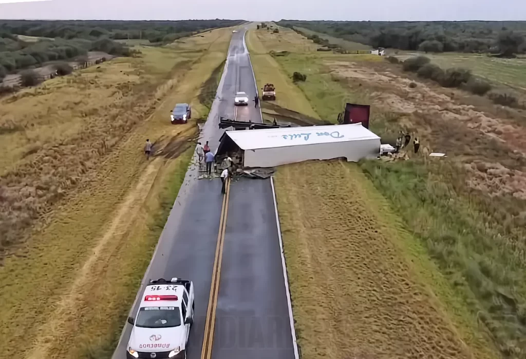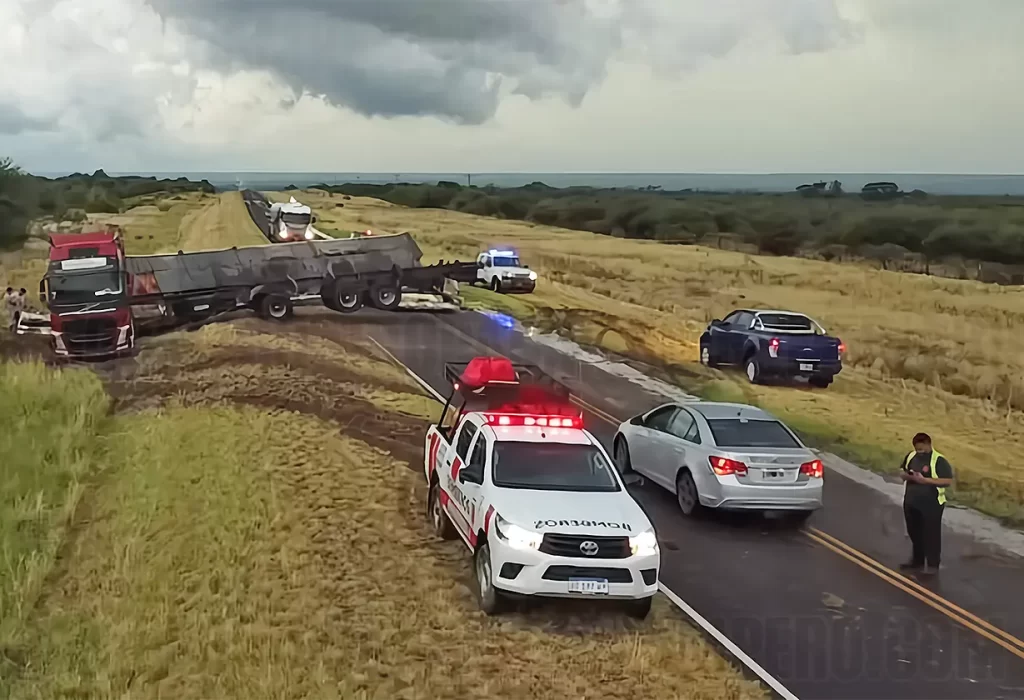 El hecho ocurrió mientras una fuerte tormenta azotaba la zona. Según informaron las autoridades, el conductor del camión Volvo perdió el control del rodado, que terminó volcando sobre la banquina.