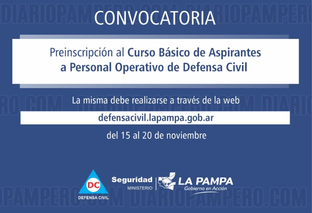 La preinscripción para el «Curso Básico de Aspirantes a Personal Operativo de Defensa Civil» se llevará a cabo en La Pampa del 27 de noviembre al 1 de diciembre. Para asegurarte un lugar, debes preinscribirte en línea entre el 15 y el 20 de noviembre a través del sitio web oficial: https://defensacivil.lapampa.gob.ar/. En este portal, encontrarás los requisitos, el formulario de preinscripción y toda la información sobre la documentación necesaria.