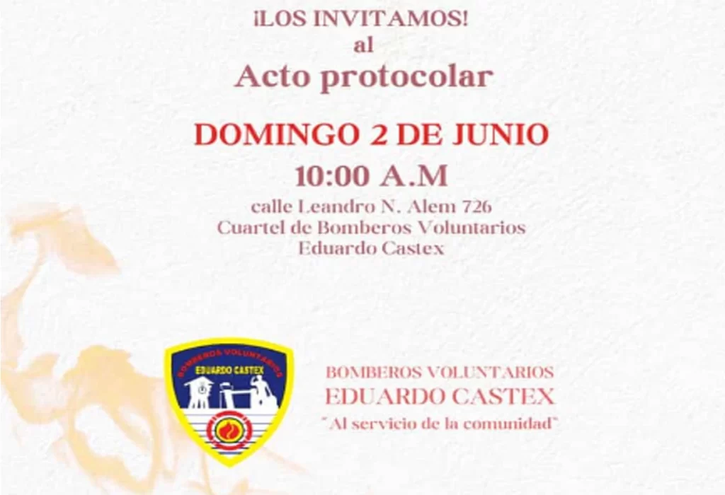 En este contexto, el destacamento de Bomberos Voluntarios de Eduardo Castex invita a todos los habitantes de la localidad a sumarse al acto protocolar que se llevará a cabo el domingo 2 de junio a las 10:00 a.m. El evento tendrá lugar en el cuartel de bomberos, ubicado en la calle Alem 726.