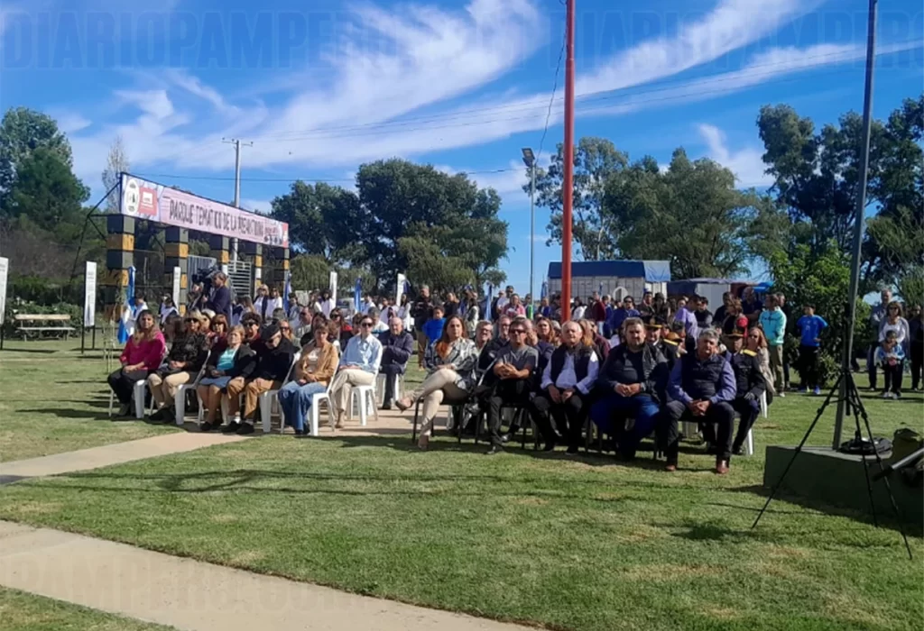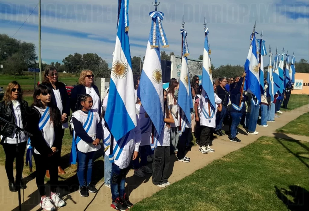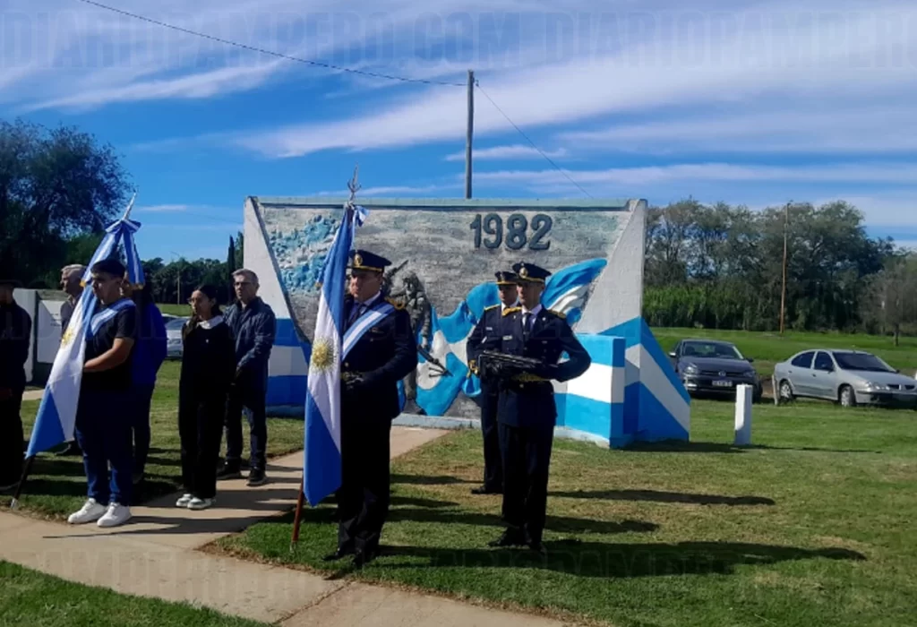 El evento se inició con la entrada de las banderas de ceremonia de distintas instituciones, seguida del izamiento del pabellón nacional a cargo de la intendente y los excombatientes. Luego, los presentes entonaron el Himno Nacional y la Marcha de las Malvinas.