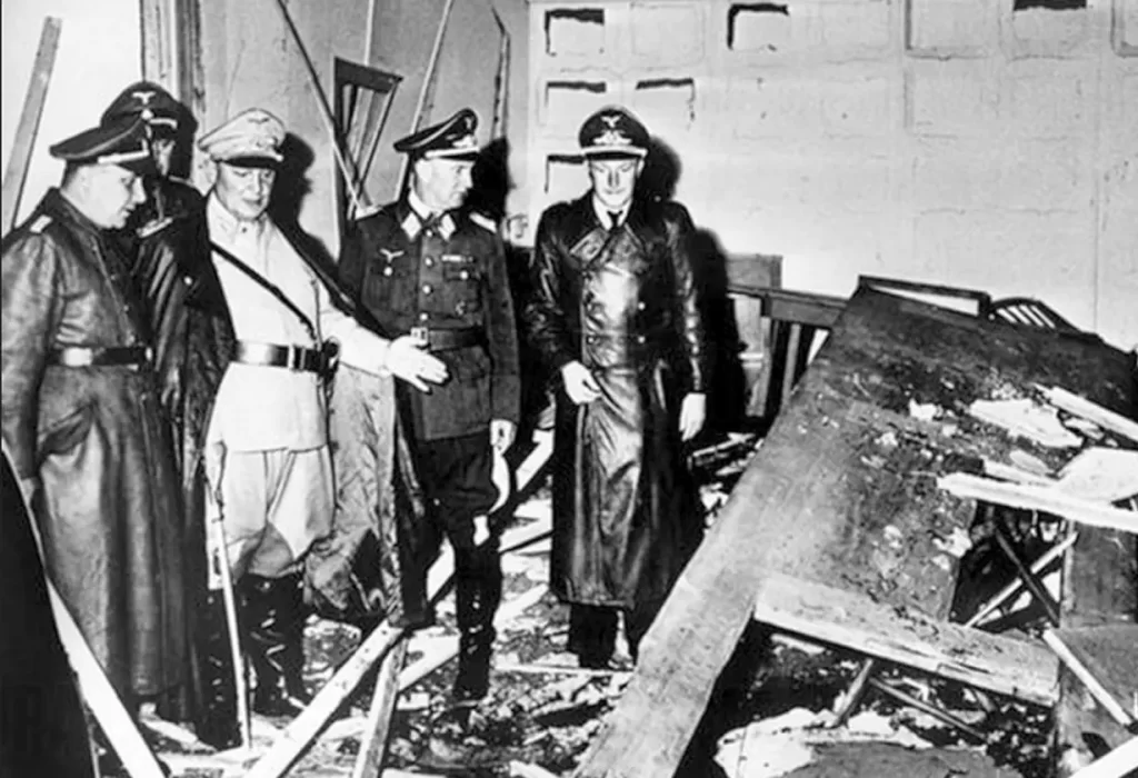 El 20 de julio de 1944, Claus von Stauffenberg llevó una maleta con una bomba a una reunión con Hitler en su guarida en Rastenburg, Prusia Oriental. Durante la reunión, colocó la maleta debajo de la mesa cerca de Hitler y se retiró rápidamente. La bomba explotó, hiriendo gravemente a varios oficiales, pero Hitler sobrevivió con heridas leves debido a que la maleta fue desplazada por una pata de la mesa, lo que creó una barrera parcial.