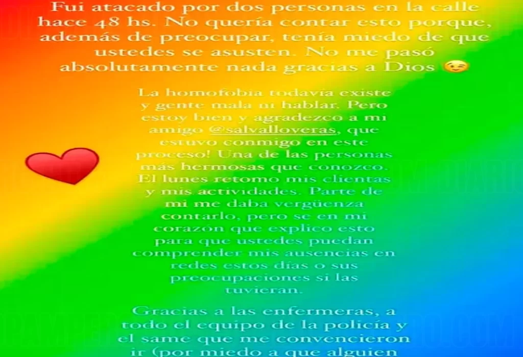 Artemis compartió los detalles del incidente a través de su cuenta de Instagram, donde reveló que había sido atacado hace 48 horas. «Fui atacado por dos personas en la calle… La homofobia todavía existe y gente mala, ni hablar», expresó el diseñador, quien agradeció a su amigo Salvador Lloveras por su apoyo durante este difícil proceso.