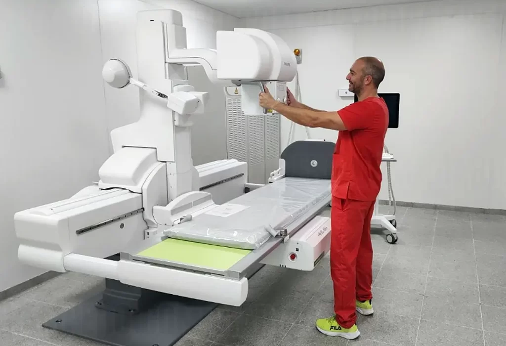 La radioscopía o fluoroscopía, que emplea un haz ininterrumpido de rayos X para generar imágenes secuenciales proyectadas en un monitor, permite estudiar la dinámica de tránsito de objetos dentro del cuerpo humano, como catéteres de marcapasos, líquidos durante la deglución o guías médicas. Esto permite obtener diagnósticos rápidos y confiables, con una calidad de imagen única, y además, el equipo ofrece un flujo de trabajo automatizado con ajuste de dosis en tiempo real para una mayor eficiencia y precisión.