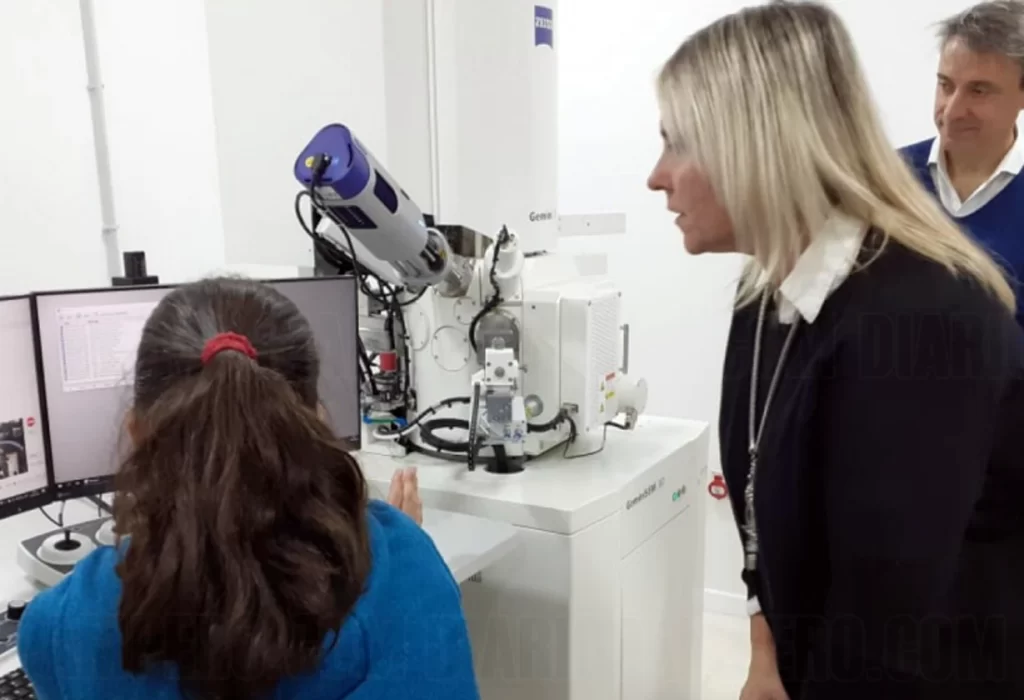 Rocio Comas, investigadora del INCITAP, detalló el funcionamiento del microscopio electrónico, explicando que puede trabajar con muestras orgánicas e inorgánicas y cuenta con siete detectores que permiten obtener información detallada de las superficies analizadas. Comas también mencionó su uso en el área de suelos, demostrando la amplitud y versatilidad del equipo.