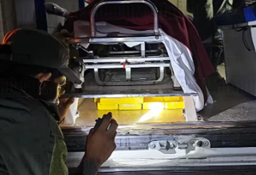 Las sospechas se intensificaron cuando los ocupantes no pudieron proporcionar una explicación coherente sobre el motivo de su viaje y se descubrió que el suero no estaba conectado a la paciente. Tras una inspección más detallada, los agentes encontraron tornillos removidos debajo de la camilla, lo que indicaba la presencia de un doble fondo. El can antinarcóticos «Terra» también marcó la posible existencia de drogas.