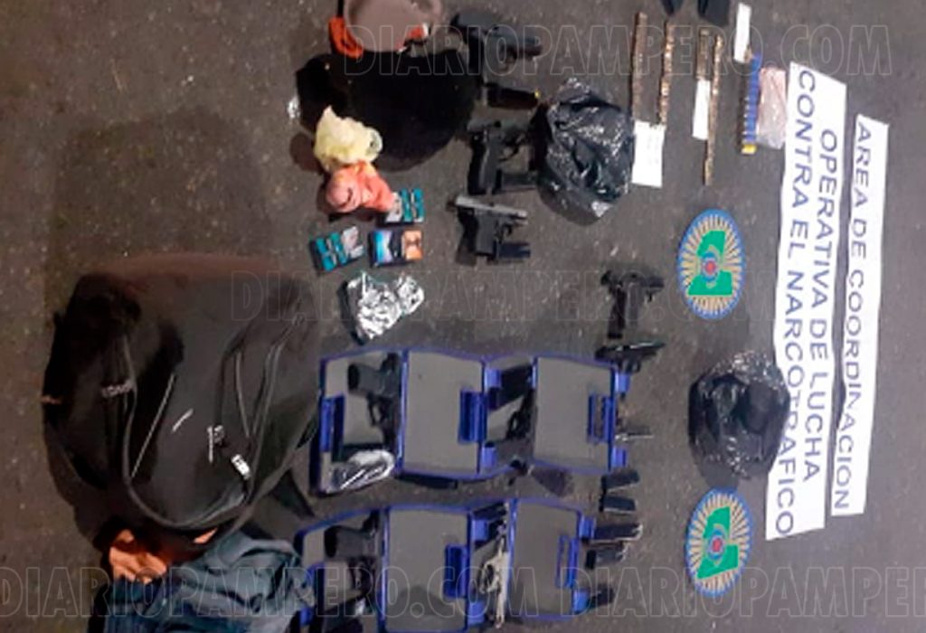 Además, durante la identificación de los pasajeros una mujer de Lomas de Zamora manifestó llevar armas de fuego en su mochila. En un registro posterior, se encontraron diez armas de fuego de puño, incluyendo nueve pistolas y un revólver, así como una billetera con 32.220 pesos y una riñonera con 800 dólares. Todos estos elementos fueron incautados por el personal policial, en colaboración con la Fiscalía Temática de Delitos contra la Propiedad. El Juez Federal de La Pampa, Juan José Baric, dispuso la detención de los implicados en ambos sucesos, enmarcando los casos bajo la causa «S/Infracción a la Ley Nacional de estupefacientes 23.737».