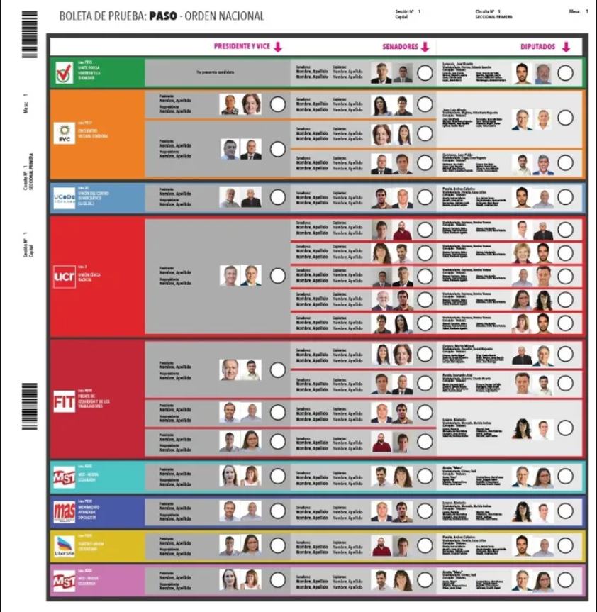 En la categoría de senadores nacionales, aparecen con foto los dos candidatos titulares, al igual que el candidato a presidente y vicepresidente.