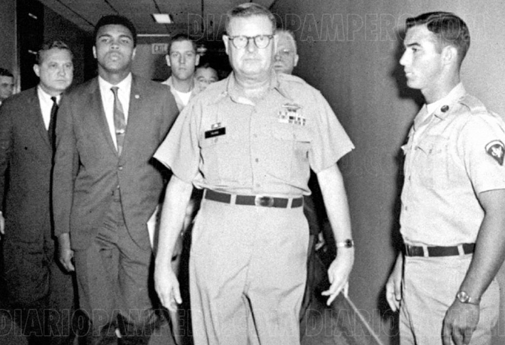 En 1966, en plena Guerra de Vietnam, Ali fue convocado para el servicio militar obligatorio. Sin embargo, Ali se negó a unirse al ejército, citando motivos religiosos y personales. Ali se había convertido al Islam y se había unido a la Nación del Islam, un grupo religioso afroamericano que se oponía a la participación de sus seguidores en la guerra. Ali declaró públicamente: «No tengo ninguna pelea con esos vietcong… Ellos nunca me llamaron nigger» (un término despectivo utilizado contra las personas negras en ese tiempo). Su negativa a participar en la guerra generó controversia y provocó una fuerte reacción en el país.
