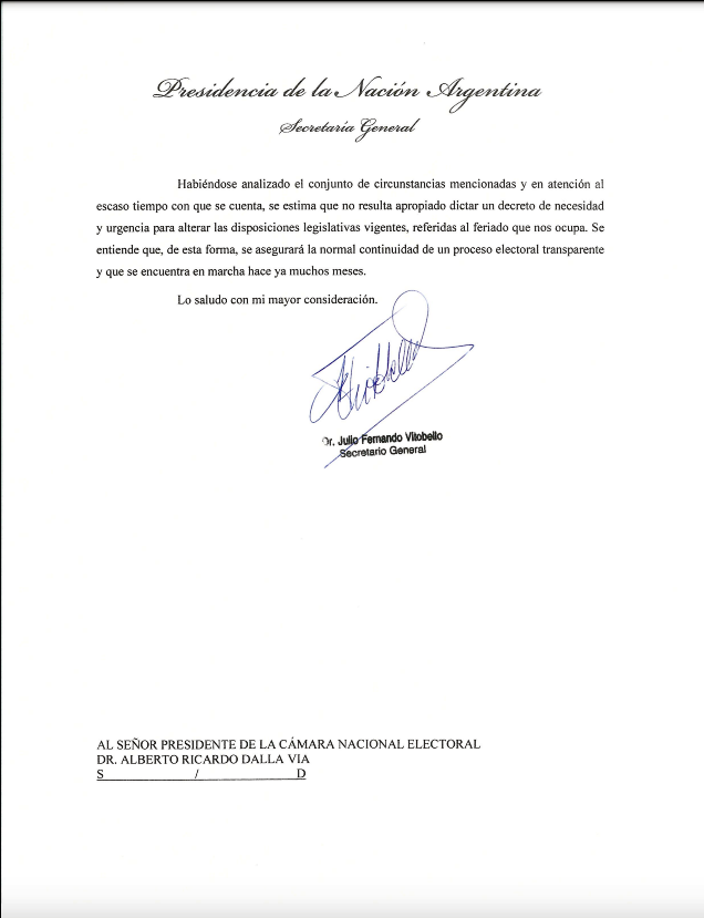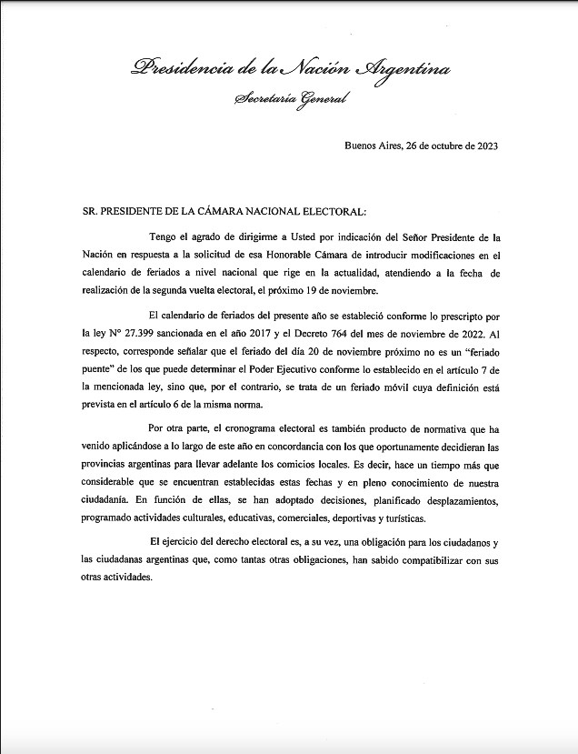 La decisión fue en respuesta a un pedido realizado por la Cámara Nacional Electoral (CNE), que había solicitado evaluar el corrimiento del asueto ya que podría afectar la concurrencia a votar el domingo 19, fecha estipulada para el balotaje entre Sergio Massa y Javier Milei.