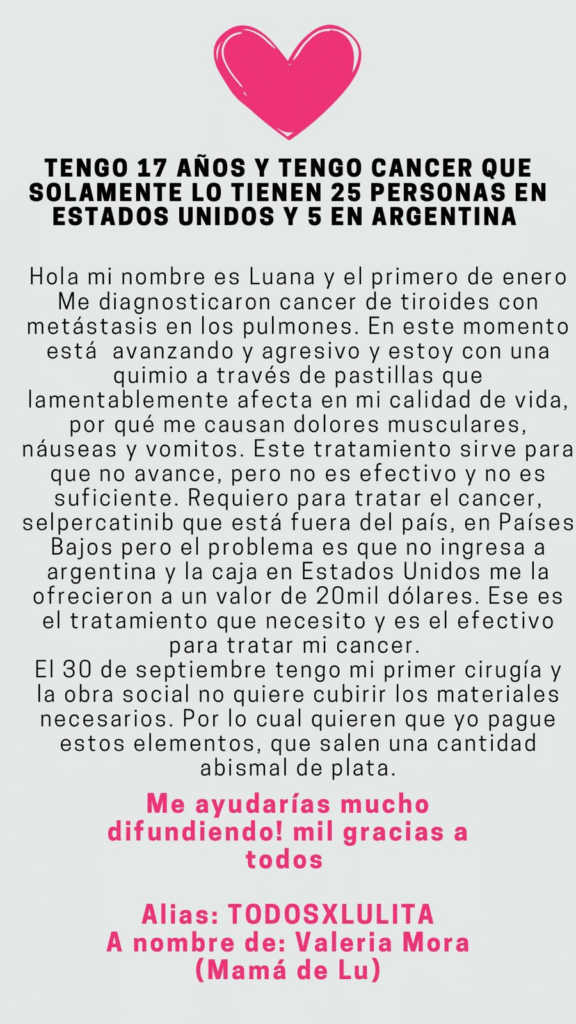 Infórmate en DiarioPampero.com – Luana Santori, de 17 años, enfrenta un cáncer de tiroides con metástasis en los pulmones, una condición que afecta solo a cinco personas en Argentina y 25 en Estados Unidos. Diagnosticada en enero, requiere una operación el 30 de septiembre, pero la obra social no cubre insumos ni aparatología. Además, necesita Selpercatinib, un medicamento importado de Países Bajos o Estados Unidos por 20 mil dólares mensuales. Comparte su situación en redes para recaudar fondos vía Alias “TODOSXLULITA” a nombre de su madre, Valeria Mora.