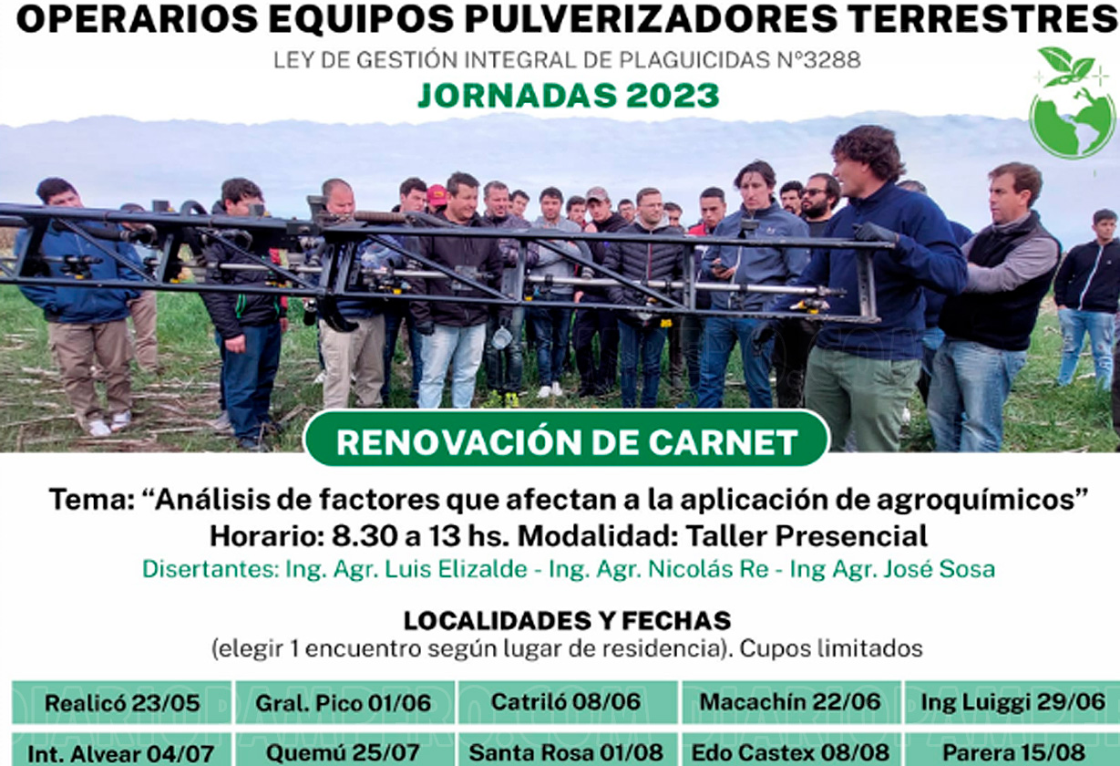 La Dirección de Agricultura del Ministerio de la Producción continúa con las capacitaciones destinadas a la renovación del carnet para operarios de Equipos Pulverizadores Terrestres. En esta oportunidad será mañana 29 en la localidad de Ingeniero Luiggi.