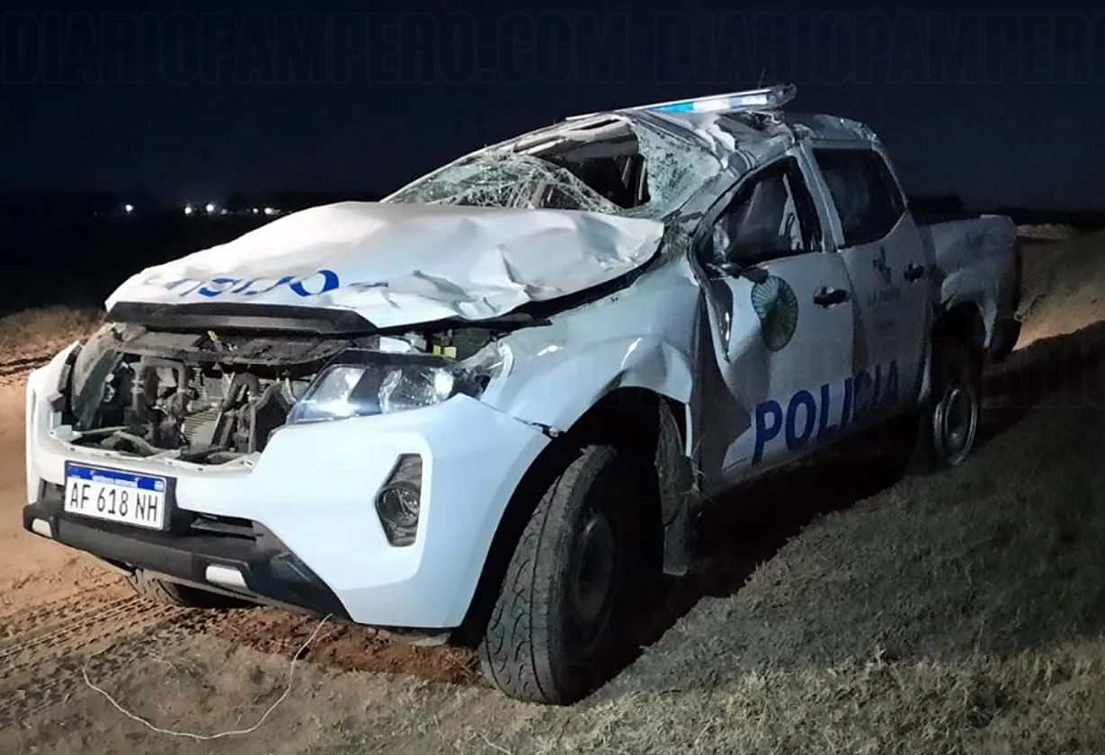 Dos agentes de Bernardo Larroudé sobreviven a un violento vuelco en estancia rural durante respuesta a llamado de emergencia, atribuido al deterioro del camino interno. Lesiones leves y rápida atención médica.