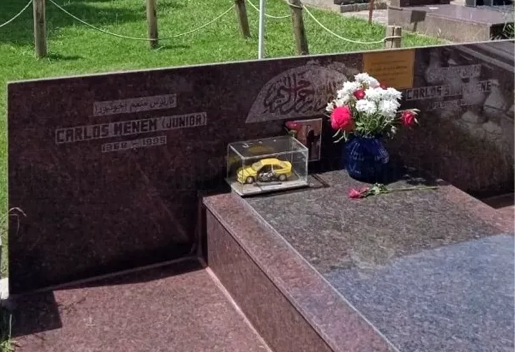 Carlos Menem Jr., quien falleció en 1995 en un accidente de helicóptero cerca de la ciudad de Ramallo, descansa junto a su padre, el expresidente Carlos Menem, en este lugar de reposo. Aunque Menem profesaba la religión católica, su hija Zulemita Menem, en su momento, indicó que la decisión de enterrarlo en el cementerio islámico fue tomada por la familia, permitiendo que padre e hijo compartieran un espacio final en este recinto.